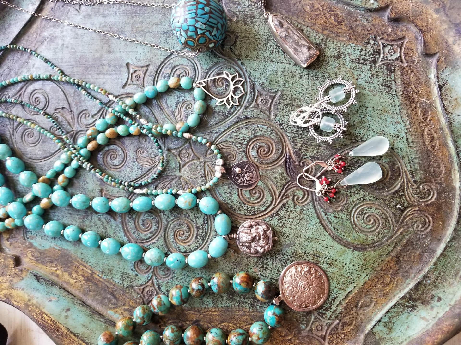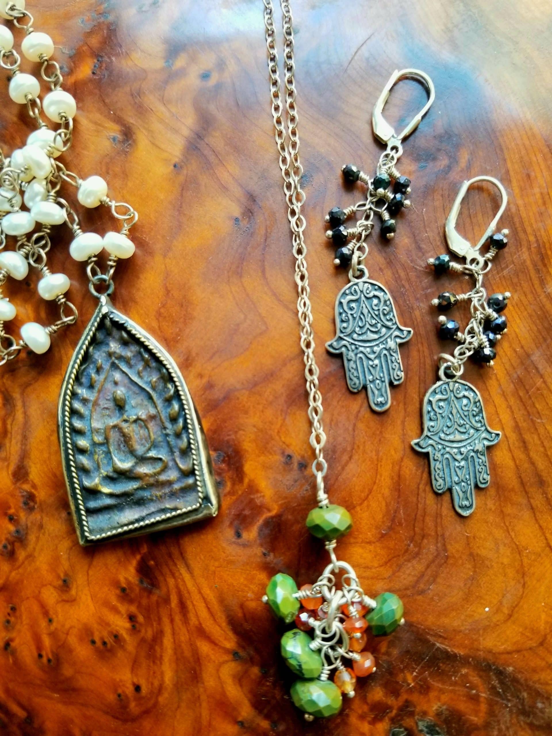 Sue starts creating every piece with an intention. She finds inspiration when doing yoga. During Covid she became yoga teacher certified in kundalini yoga and began selling her jewelry on Facebook. She uses Buddhas, Ganeshas, lotus flowers, Oms, semi-precious stones, Thai silver and sterling silver in her pieces.