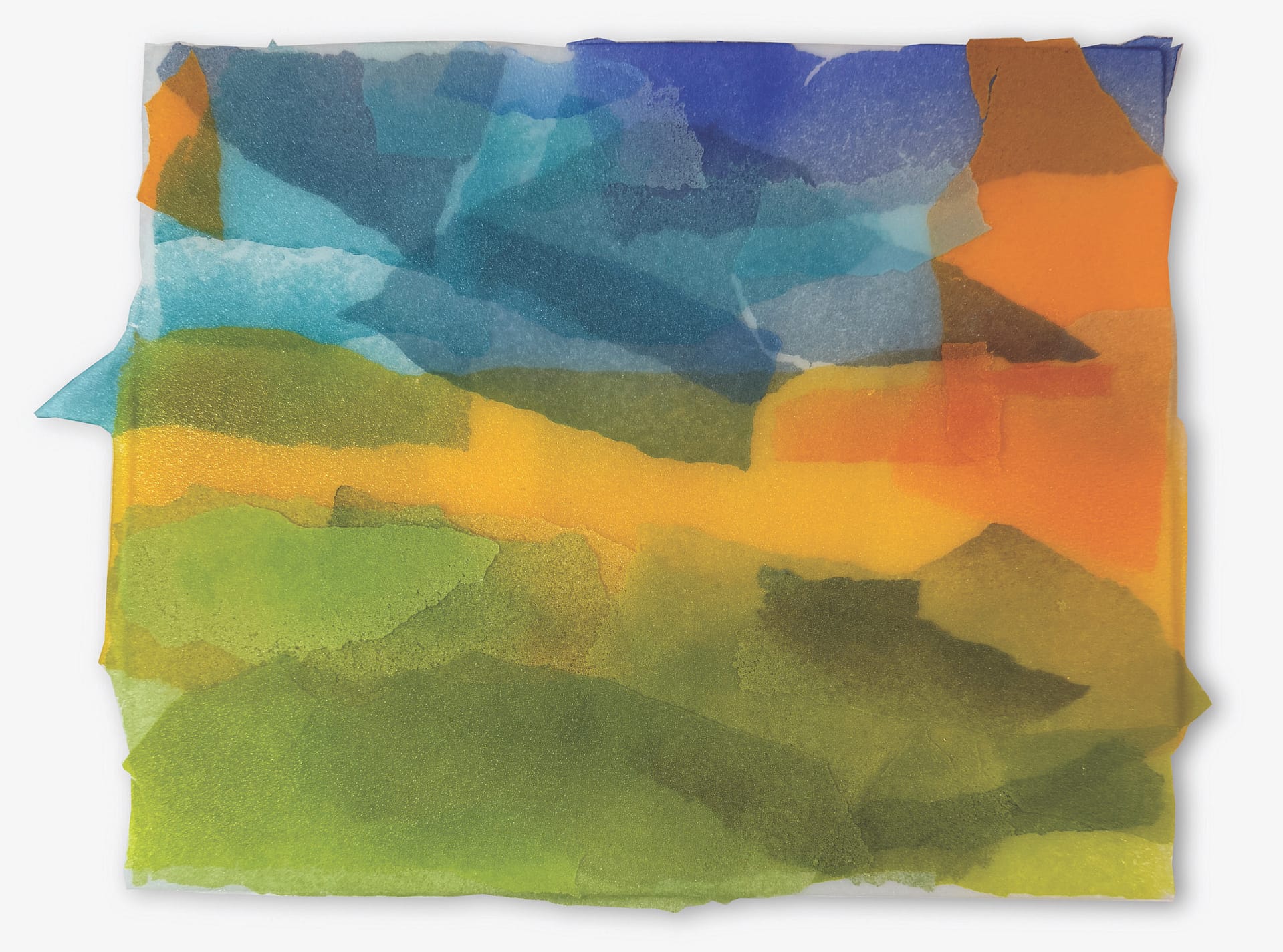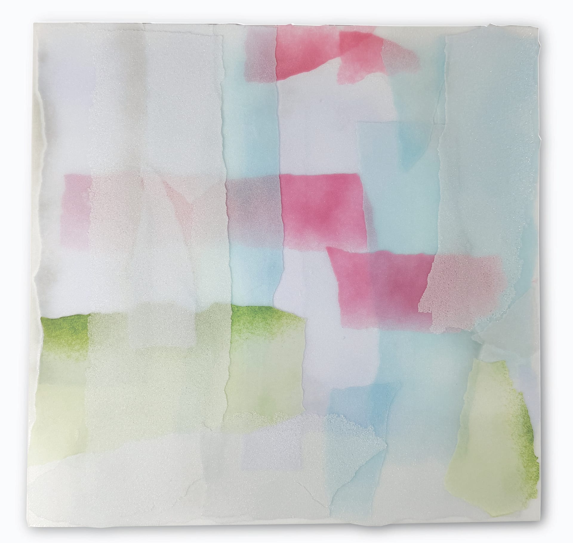 During firing, the wafers sometimes shift unexpectedly, allowing transparency to develop in layers that mimic the softness of watercolor washes.