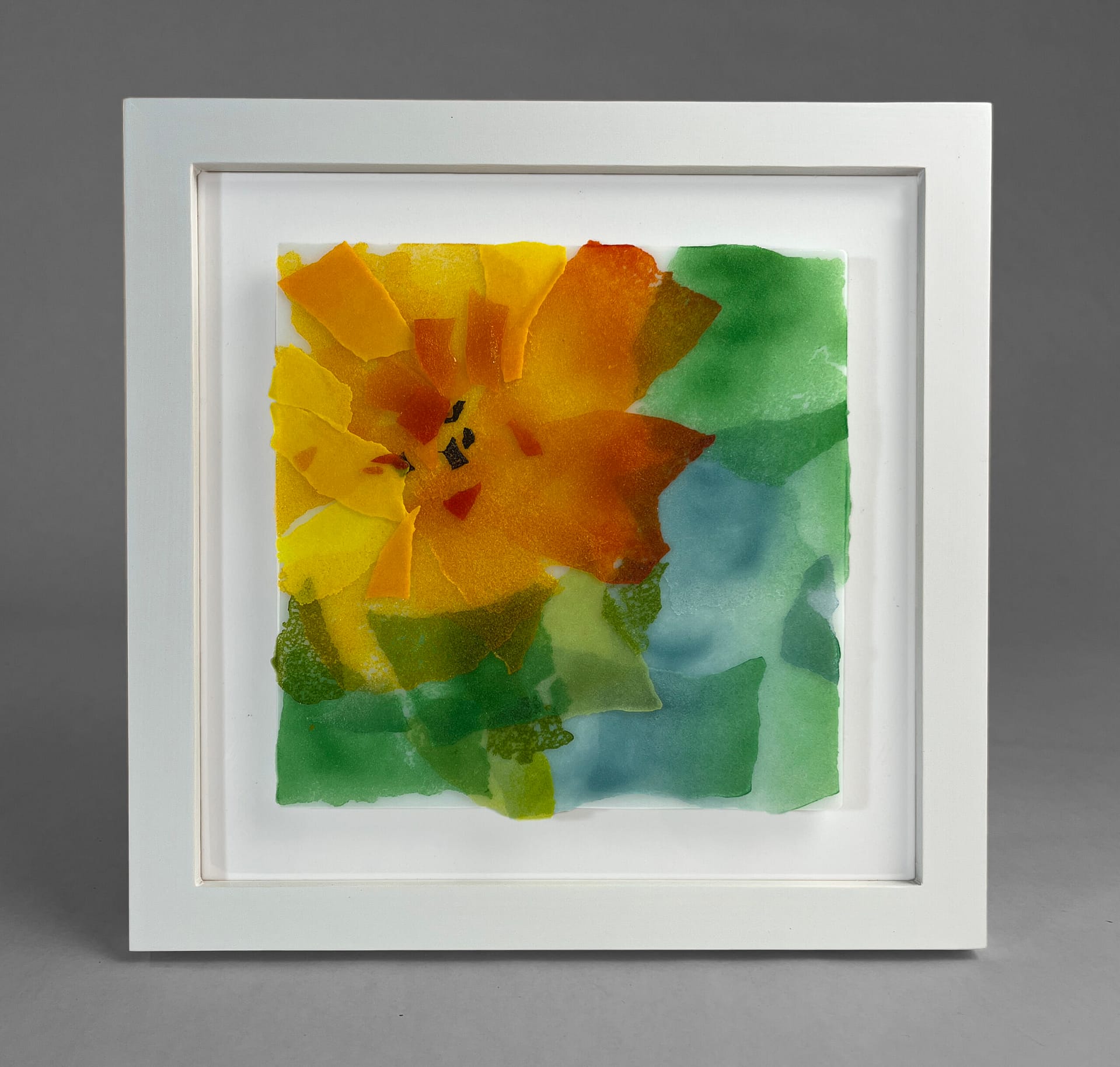Long before she ever touched molten glass, Elaine was learning how to see. It began in northern Ohio, where summer unfolded slowly through the neighboring garden, petals opening in layers, leaves shifting with the light, colors deepening before fading again. Those early observations left a quiet but lasting impression. Nature is constantly transitioning, revealing new details to anyone patient enough to look closely. Today, that same sensitivity defines Elaine’s work. From her Fine Art, to her Glass Collage Paintings, and even her custom Commissions. Now based in Arizona, she creates kiln-formed glass pieces that feel like preserved moments, fragments of transformation held still. Leaves curl as if caught mid-fall. Surfaces carry the softness of weathered stone or the grain of bark. Color drifts across panels.