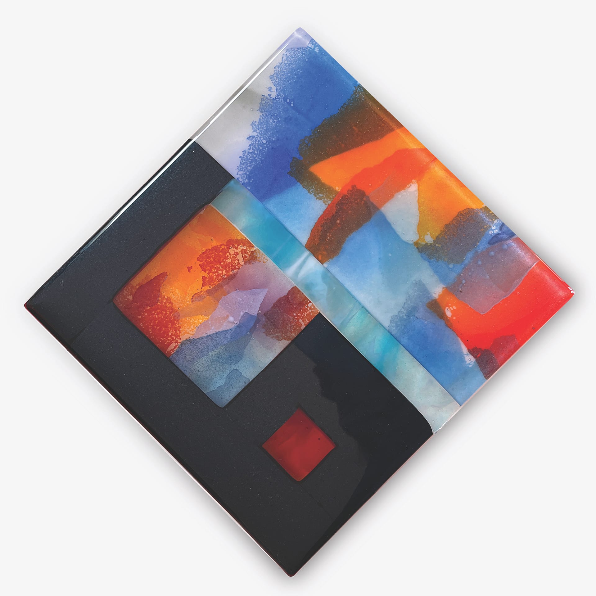 For Elaine, Glass is not merely a medium. It is a language uniquely suited to impermanence. She started learning this language, after earning a degree from Purdue University with a double major in Graphic Design and Industrial Design, and built an early career creating balanced, visually compelling compositions for marketing materials. That training remains unmistakable in her artwork today. Every element feels intentional. Every placement is considered. Harmony is never accidental. Yet it was glass that ultimately expanded her creative vocabulary. Fascinated by its optical depth and fluid behavior, Elaine apprenticed with a glassblower in the early 2000s before continuing her studies across the country, from Bullseye Glass in Portland to UrbanGlass in New York.