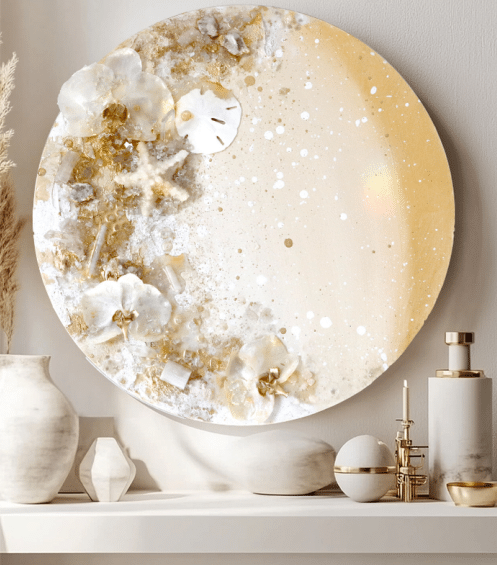 Her work is rooted in emotional authenticity and elemental connection and encourages personal reflection and contemplation. Her creations blend acrylics, sand, mica, and precious gemstones, chosen for their beauty and energetic resonance.