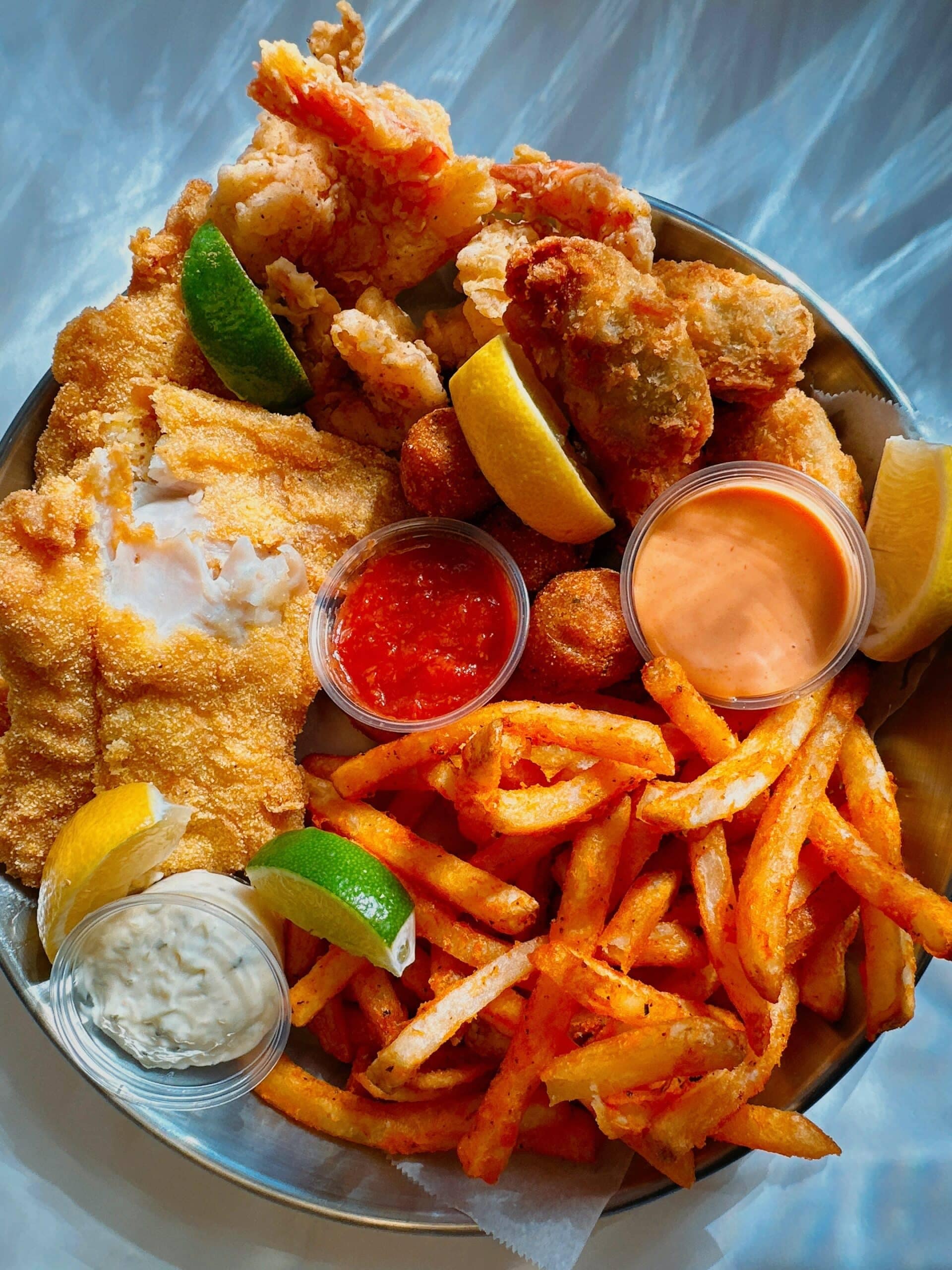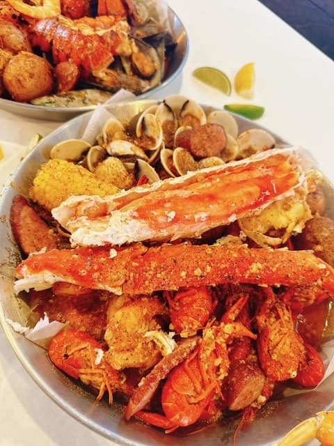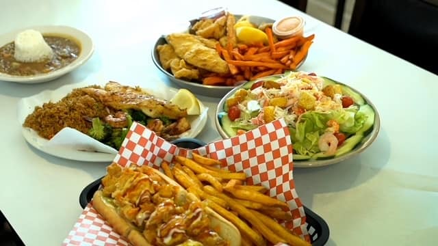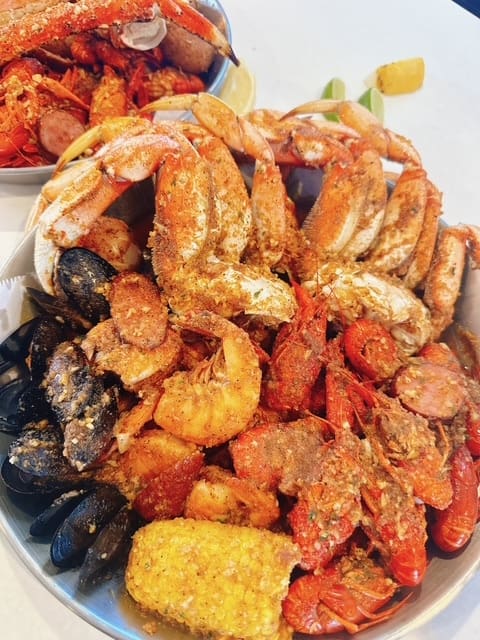 Crab legs crack open to reveal sweet, tender meat that’s soaked in seasoning. Shrimp are plump and perfectly cooked, snapping cleanly with each bite. Crawfish offer that satisfying peel-and-pop ritual that seafood lovers crave. Every piece is coated in a luscious, flavor-packed signature sauce that invites you to dip, dunk, and mop up every last drop. For guests who gravitate toward crispy comfort, the fried baskets are a must-try. Golden fillets of tilapia or flounder arrive lightly breaded and fried to a delicate crunch, never oily, always hot and fresh. Jumbo shrimp are another standout: juicy on the inside, crackling on the outside, ideal with a squeeze of lemon and a generous swipe through house-made sauce. Served with fries or seasoned potatoes, these baskets transform classic seafood into something you’ll remember long after the last bite.