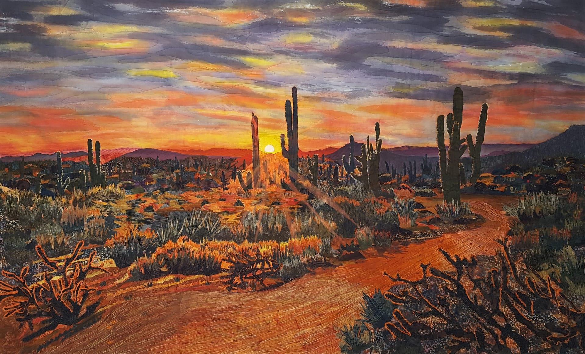 Her message resonates deeply. There is no single correct way to create. There is only honesty and commitment to the work. Respected galleries, including the Tubac Center of the Arts, Southern Arizona Arts Gallery, and Tombstone Art Gallery, represent her art. Collectors are drawn to the tactile richness of her pieces and the sense of story woven into every stitch.