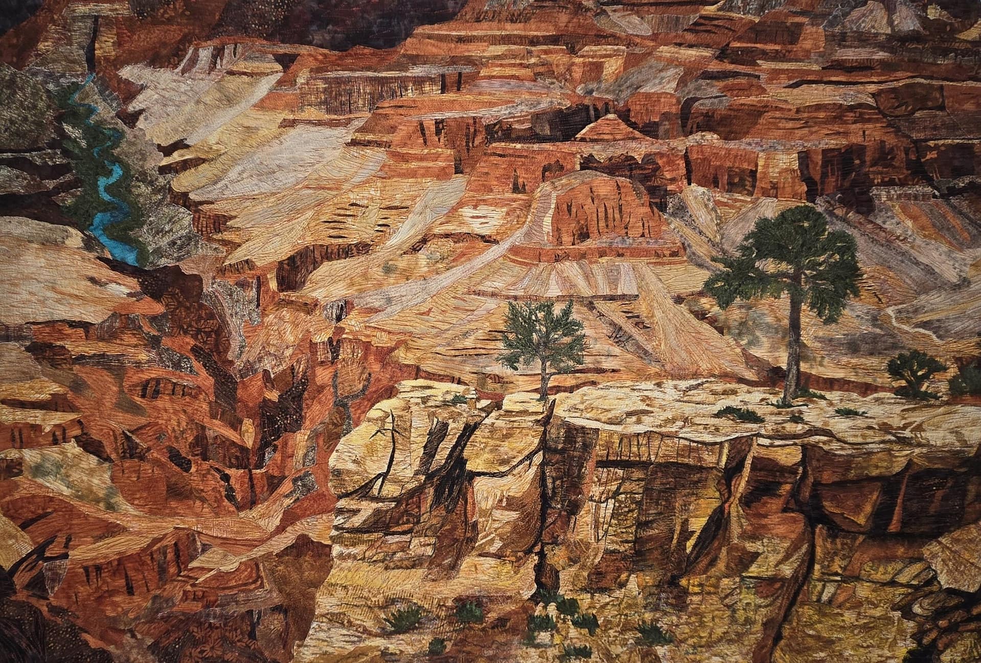 Nature is a frequent muse for Deb, but her work is never a simple representation of landscape or figure. Instead, it captures feeling. In some of her works, canyon walls glow from within, layered with texture that suggests both erosion and endurance. While in some of her wildlife pieces, form and movement emerge with quiet strength, reminding viewers that fiber can be both delicate and powerful. Her ability to bridge craft and fine art has earned significant recognition. Deb’s work has been honored at major exhibitions, including AQS QuiltWeek, Road to California, and the International Quilt Festival Houston. She has also received accolades at Vision Gallery and the Herberger Theater Center, collecting multiple Best of Show, First Place, and Viewers’ Choice awards. Yet Deb says that people talking about the emotional impact or how her work makes them feel is the highest award.