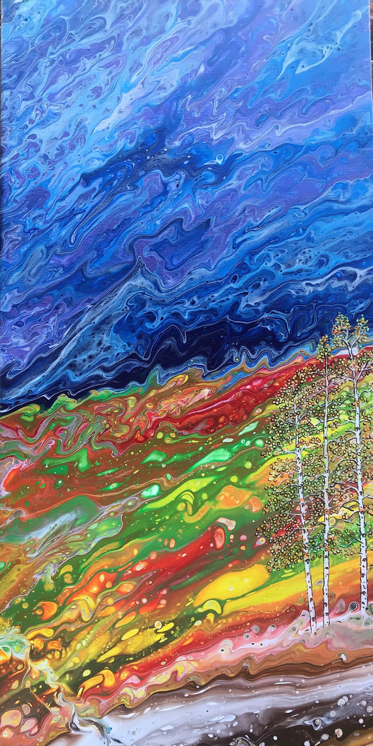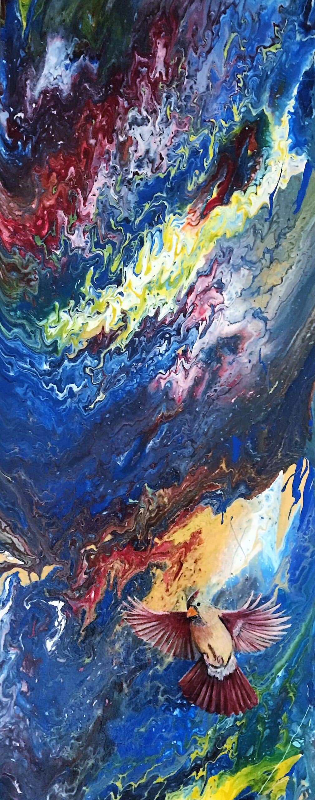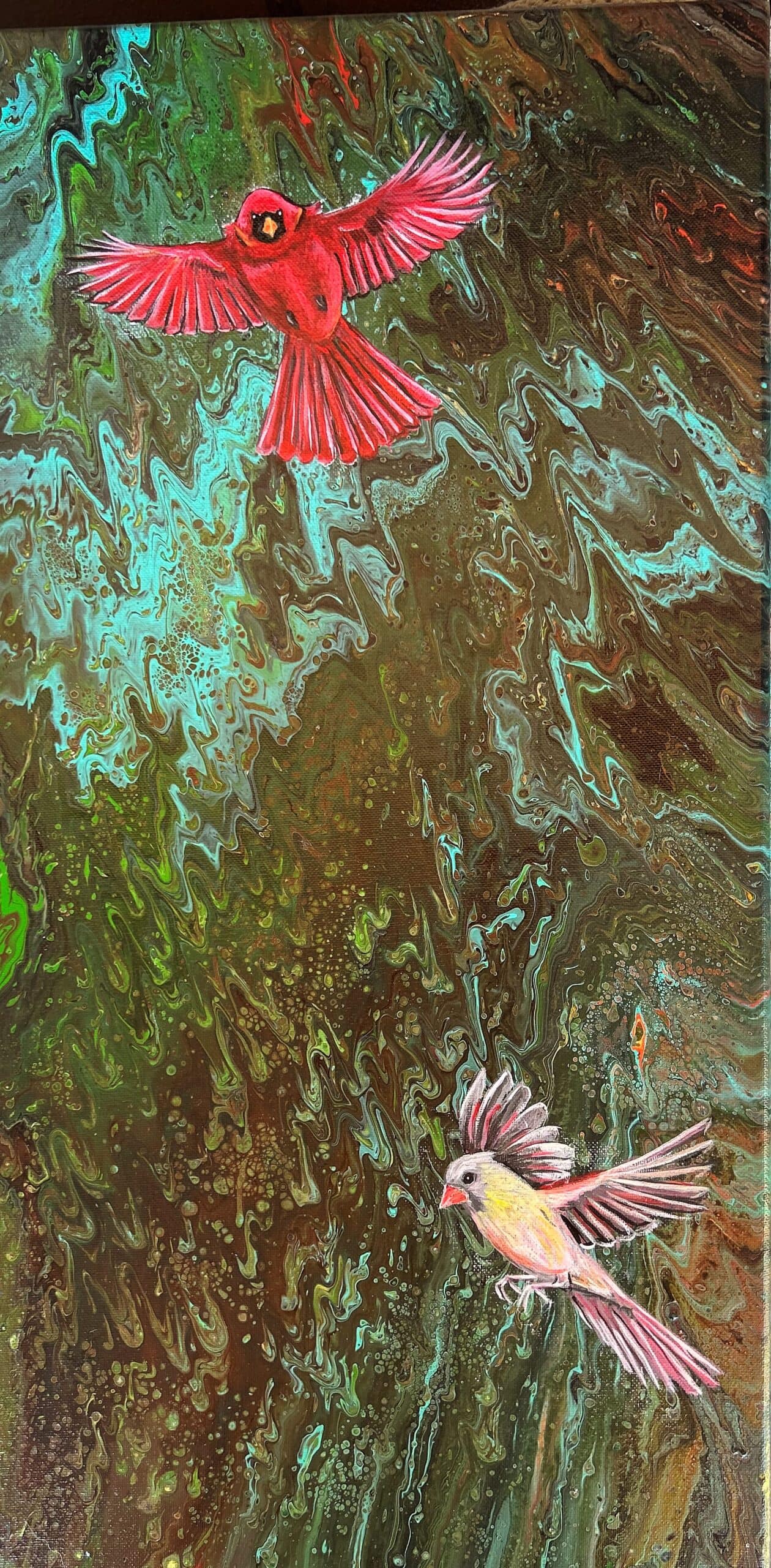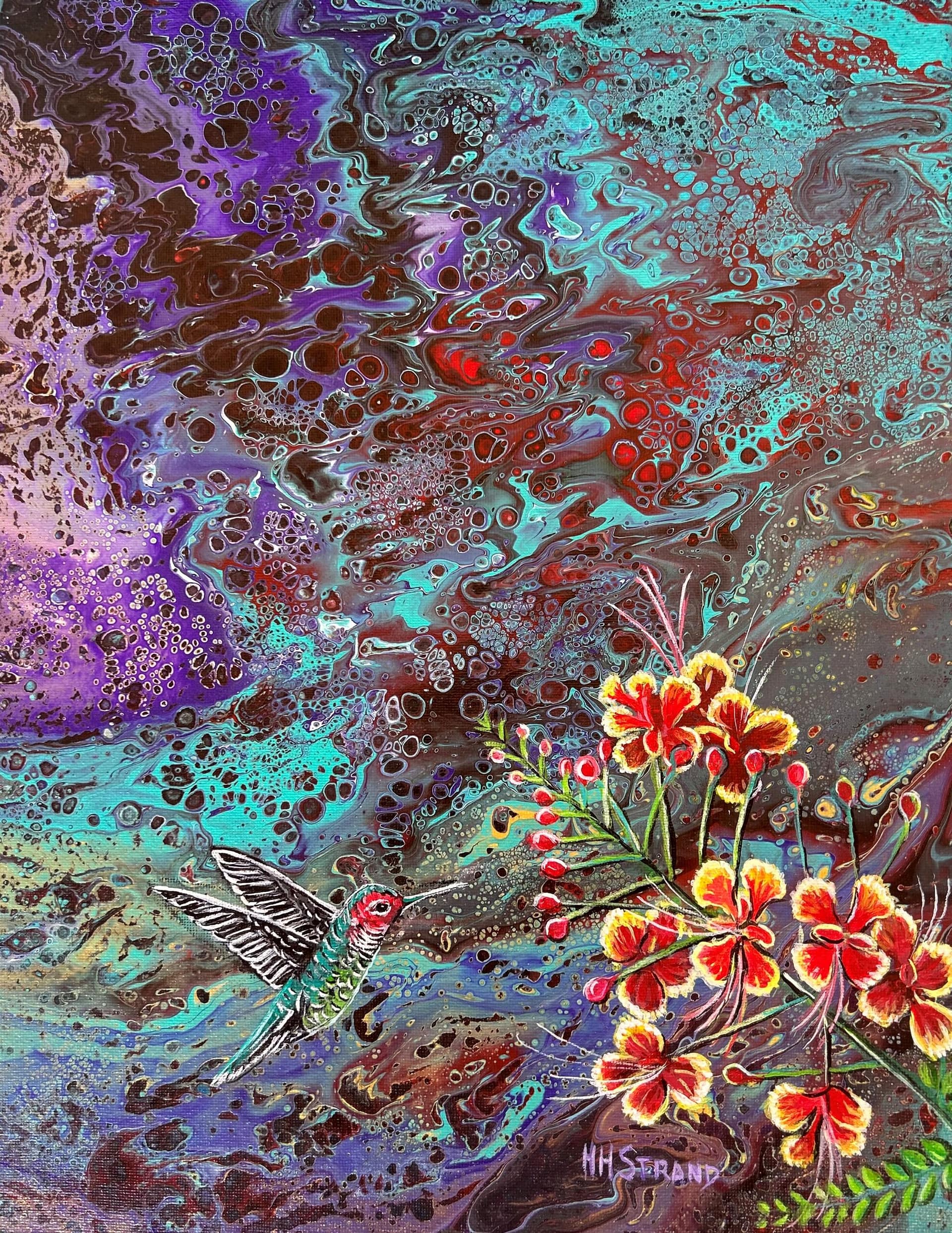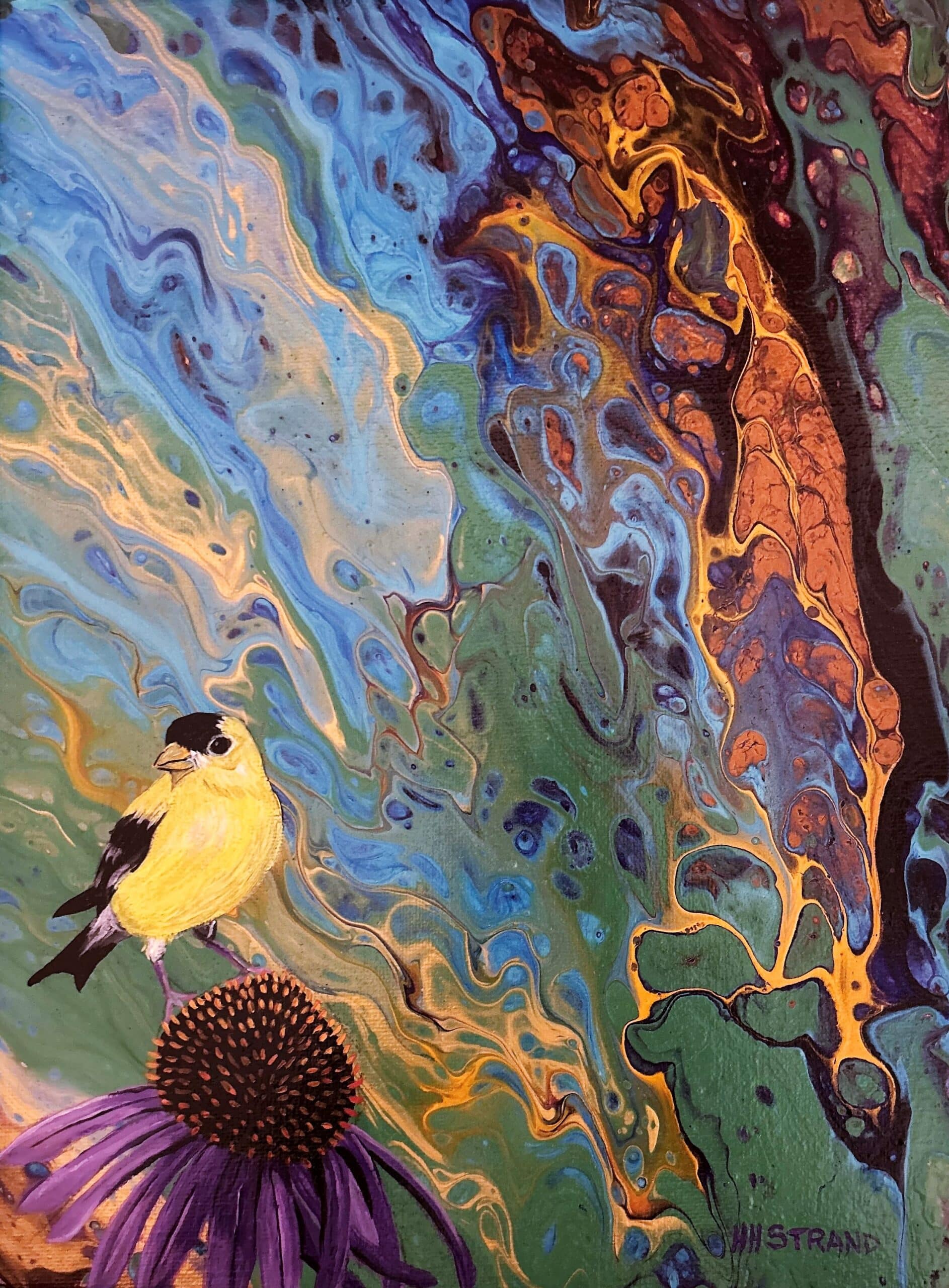 During the pandemic, Strand began experimenting with acrylic pour techniques, an approach that introduced a new level of movement and spontaneity into her work. Rather than leaving the process purely abstract, she thoughtfully integrated elements of realism into the fluid backgrounds.