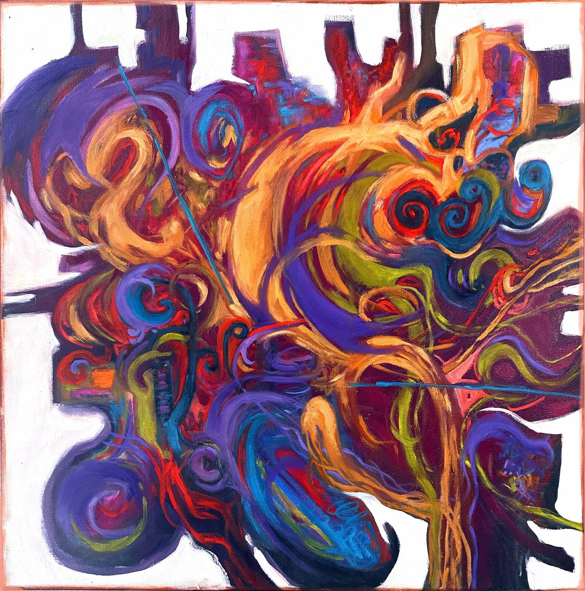 She describes her process almost philosophically. Thin layers of paint overlap, merge, and evolve across the canvas, echoing what she sees as the layered nature of reality itself.